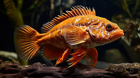 an orange fish gracefully swims amidst lush green plants in an aquarium. the fish showcases a stunning combination of dark orange and light gold hues, creating a visually captivating scene. rendered using unreal engine, this realistic animal portrait is captured in high-definition, offering a detailed and immersive experience. this full-body image can be found on flickr. ai generated