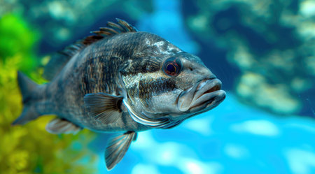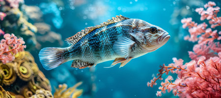 A vibrant fish glides through a sunlit underwater realm, surrounded by lush seaweed and coral. sunbeams filter through the water, the intricate patterns on the fish's scales, creating a serene oceanic landscape. Generative AI