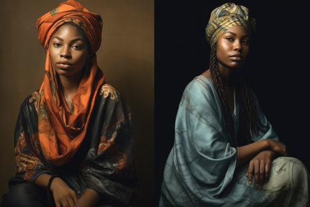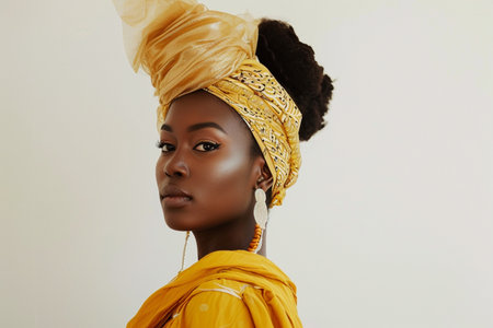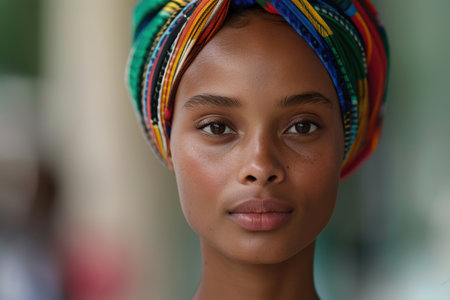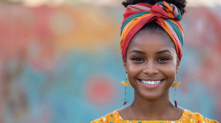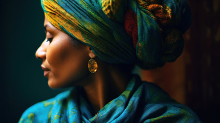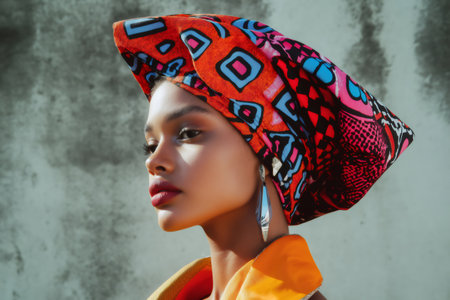 A vibrant woman exudes cultural pride with a colorful head wrap and striking facial features