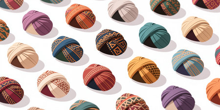 A repeating pattern of multicultural turbans with diverse, vibrant colors and intricate designs casting shadows on a white background.