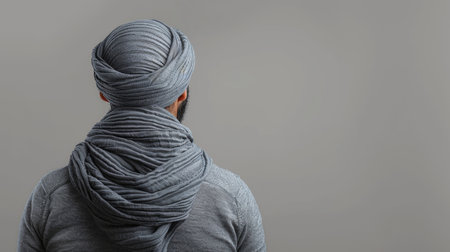 Rear view of an Arab man wearing a traditional gray turban and clothing, standing against a neutral background. The image conveys simplicity, tradition, and cultural identity.