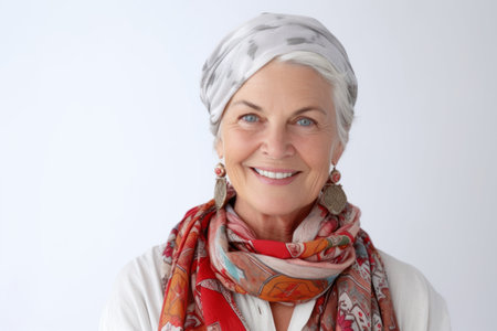 Portrait of a beautiful senior woman with scarf on white background.