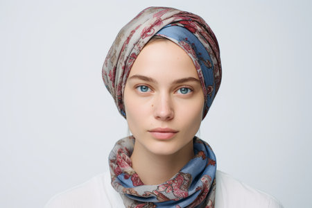 Portrait of a beautiful young woman in a headscarf on a white background