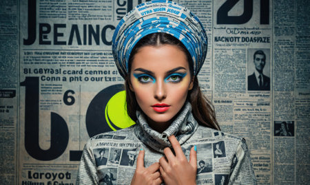 A woman with blue eyeshadow and a patterned headscarf poses in front of a wall of old newspapers