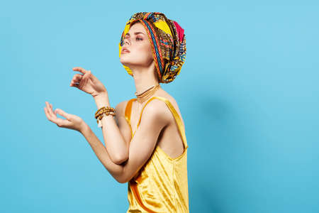 pretty woman in multicolored turban attractive look Jewelry smile blue background