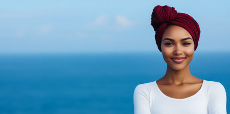 A woman stands confidently near the ocean wearing a vibrant head wrap. Her joyful expression reflects the beautiful blue sky and calm waters behind her.
