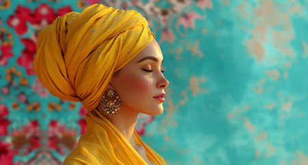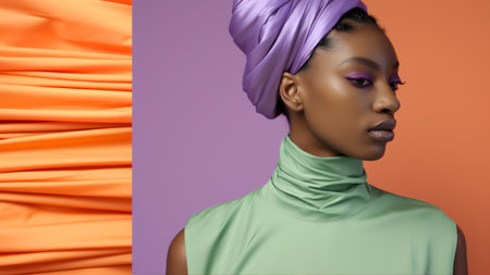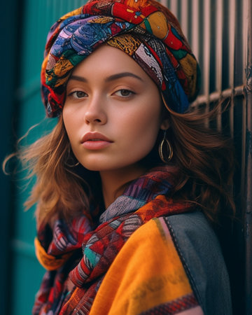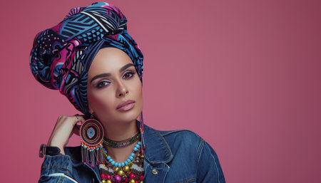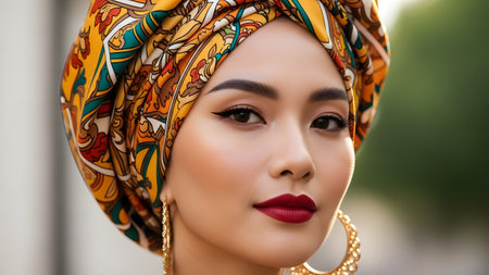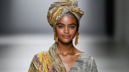 A model showcasing vibrant cultural fashion with stylish headwrap
