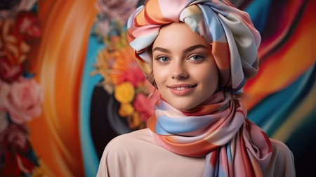 Portrait of a beautiful young woman in a headscarf on a colorful background