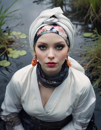 Portrait of a beautiful girl in a headscarf on the lake