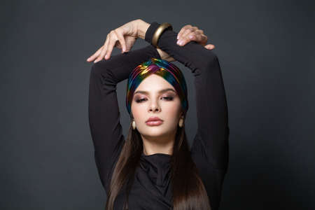 cheerful woman in multicolored turban attractive look Jewelry smile Studio Model