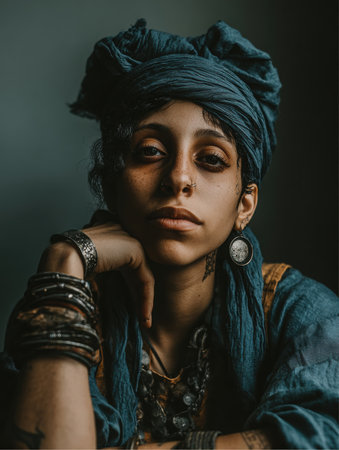 A young Woman with multiple bracelets, a head wrap, earring, and necklaces is posing for a portrait. Her arm is raised to her face in a resting pose, looking directly at the viewer.