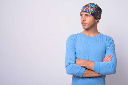 Portrait of man wearing beanie against white background