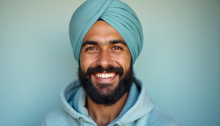 Smiling man in a turban radiating joy