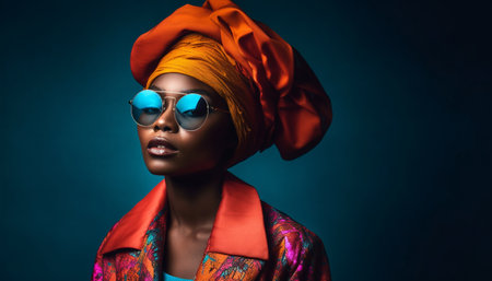 Portrait of a beautiful African American woman wearing a turban and glasses