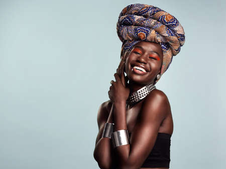 Whatever gets you glowing do that. Studio shot of a beautiful young woman wearing a traditional African head wrap against a grey background.