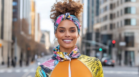 A Smiling woman in colorful workout outfit on city street