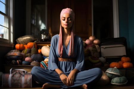 A woman sitting in a room with a bunch of pumpkins, AI