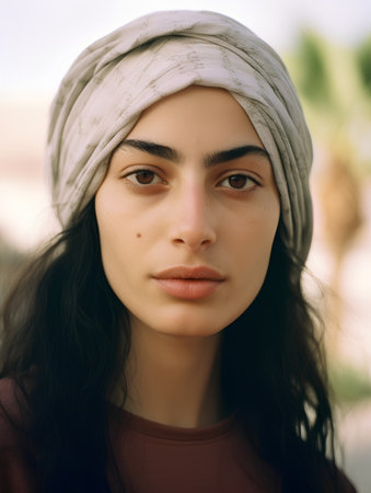 Portrait of a beautiful young brunette woman in a headscarf.