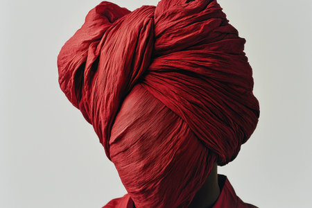 Mysterious figure with a head wrapped in red fabric, showcasing elements of cultural identity and artistic expression against a neutral background.