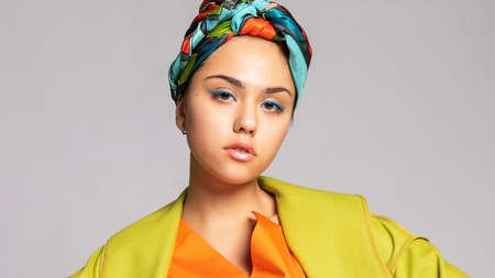 Portrait of a young woman with bright makeup and a fashionable headscarf. Light background. Beauty, fashion, makeup concept. girl in a bright green coat, bright orange dress. 16: 9 panoramic format.