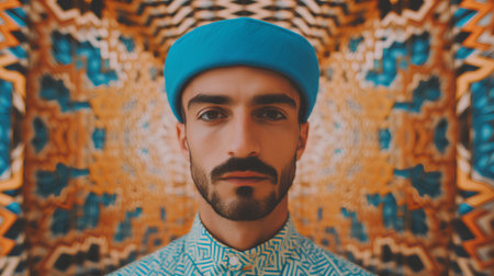 Portrait of a handsome young man with a beard in a turban and a blue hat.