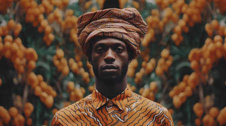 A close-up portrait of a man wearing traditional attire featuring vibrant, intricate patterns. The image highlights cultural richness and artistry in design.