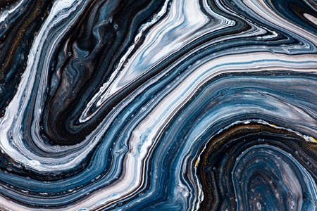 Fluid paint art, marble abstractions in blue, black.