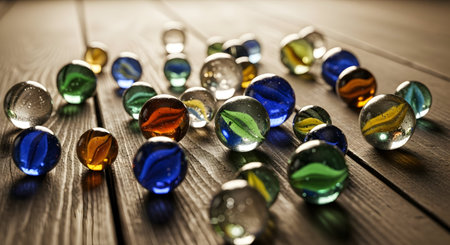 A collection of colorful glass marbles is scattered on a dark surface, displaying unique patterns and textures, evoking a sense of nostalgia and creativity, AI generated
