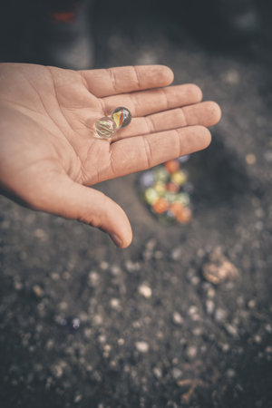Playing marbles, old children's game, colorful balls