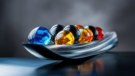 A tray of colorful glass balls sits on a table. The tray is made of metal and has a unique design. The balls are of different sizes and colors, creating a visually appealing display