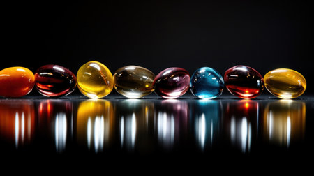 A row of colorful glass beads are lined up on a black background, AI
