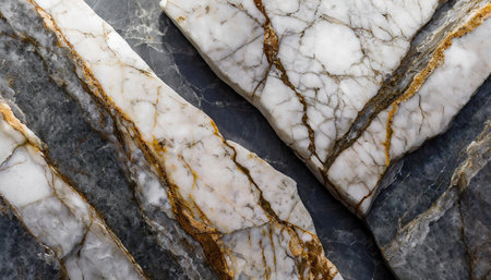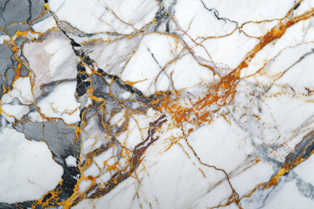 Beautiful marble slab with white and gray patterns, accented by gold veins. It highlights the natural elegance and intricate details of marble stone, AI generated image