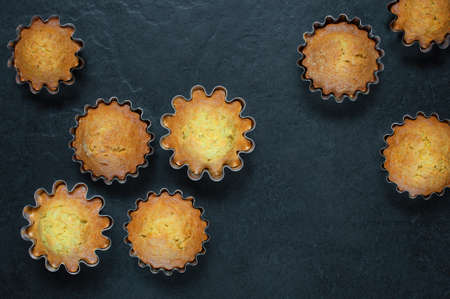 Christmas dessert - pastries from France financier cake on a black background with icing sugar sprinkled, several cupcakes have already been eaten, traces of them remain - the concept of delicious