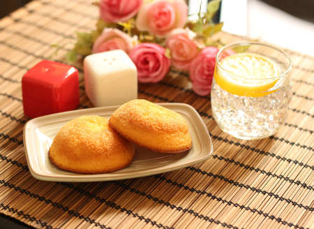 muffin cakes and cold lemonade with ice placed on wooden