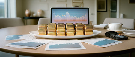 Stack of gold bars on plate with financial charts, laptop chart and calculator on table, business investment concept emotive