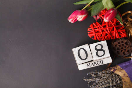 Women's day March 8 with wooden block calendar. Happy mother's day. Spring flower