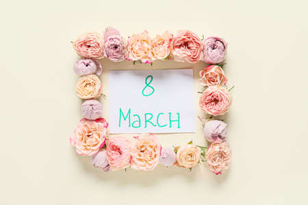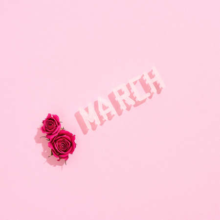 Greeting card for International Womens Day. Two little pink roses in the shape of the number eight and word MARCH made with white plastic letters