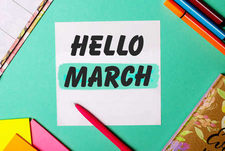 HELLO MARCH written on a turquoise background near bright stickers, notepads and markers