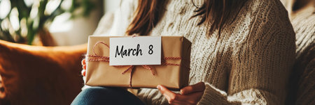 A heartwarming moment of gift exchange on March 8, with a woman receiving a present in a cozy, sunlit room, evoking feelings of love and gratitude, banner