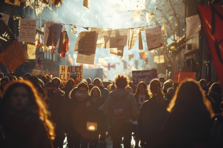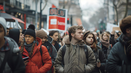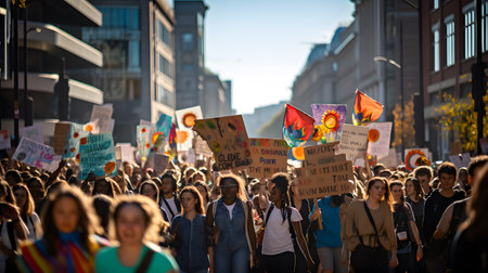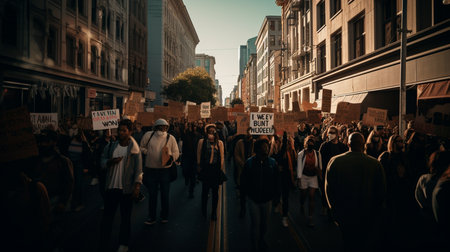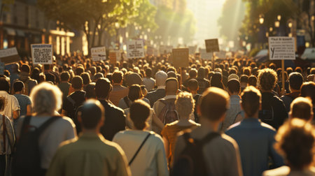 Protest Movement: A large group of people holding signs and protesting in the city. Generative AI illustrator
