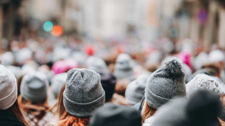 A crowd of people is captured from behind, with a focus on their heads and the knitted hats they wear. The color palette primarily includes muted tones like gray, with glimpses of other colors in the background, creating a soft, diffused lighting effect. This image could be suitable for editorial and commercial use.