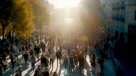High street of fictional city with lots of people going at work in the morning. Beautiful sun light at the background. Illustration made with Generative AI