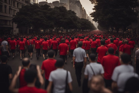 People walking at city street, aerial view. Protesting crowd. Generative AI