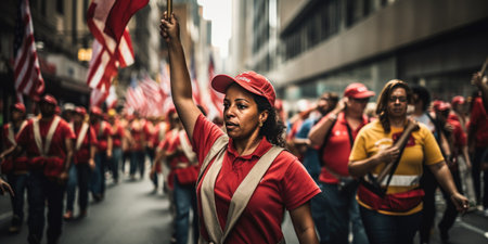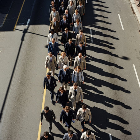 High angle top-down view of a diverse group marching peacefully in an organized civic event under ha