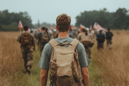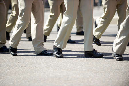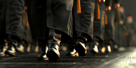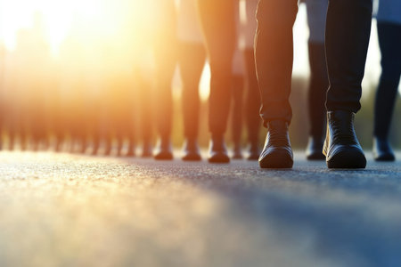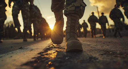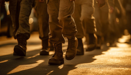 Sunlit march: silhouetted line of people walking at sunrise with focus on boots.