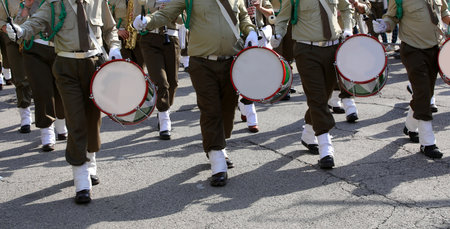marching band with many drummers and other musicians playing along the city streets during the parade