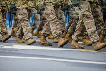 Soldiers in camouflage dress marching. Soldiers Marching In An Army Parade.