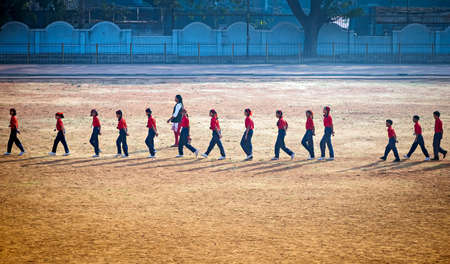 Pune, India:January 6th, 2017-Lady sports teacher guiding children to walk in a formation on playground.