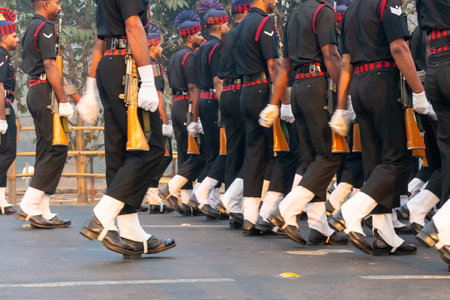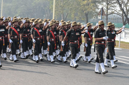 RED ROAD, KOLKATA, WEST BENGAL / INDIA - 21ST JANUARY 2018 : Indian armed force Officers are marching past with rifles , preparing for show for India's republic day celebarion on 26.01.2018.