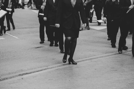 majorettes with white and blue uniforms perform in the streets of the city. photographic series